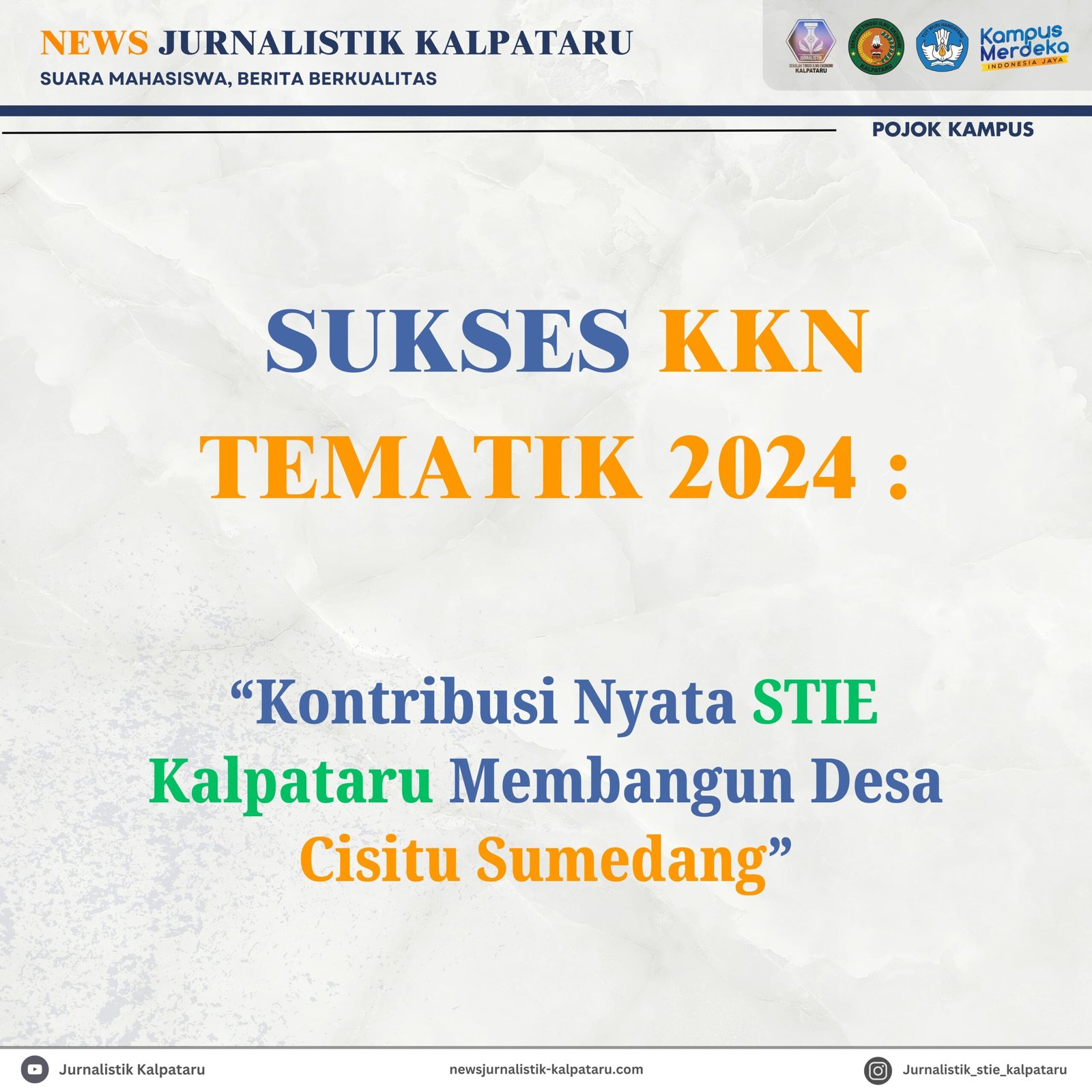 STIE Kalpataru mencatatkan sejarah baru dengan mengirimkan mahasiswa untuk berkontribusi langsung dalam pembangunan Daerah Sumedang melalui Program Kuliah Kerja Nyata Tematik Perguruan Tinggi Mandiri Gotong Royong Membangun Desa (PTMGRMD) Tahun 2024. Untuk pertama kalinya, kampus ini mengirimkan lima mahasiswanya untuk menjalankan program pengabdian di Desa Cisitu, Kecamatan Cisitu, Kabupaten Sumedang selama 4 bulan, mulai dari bulan Februari hingga bulan Juni tahun 2024.